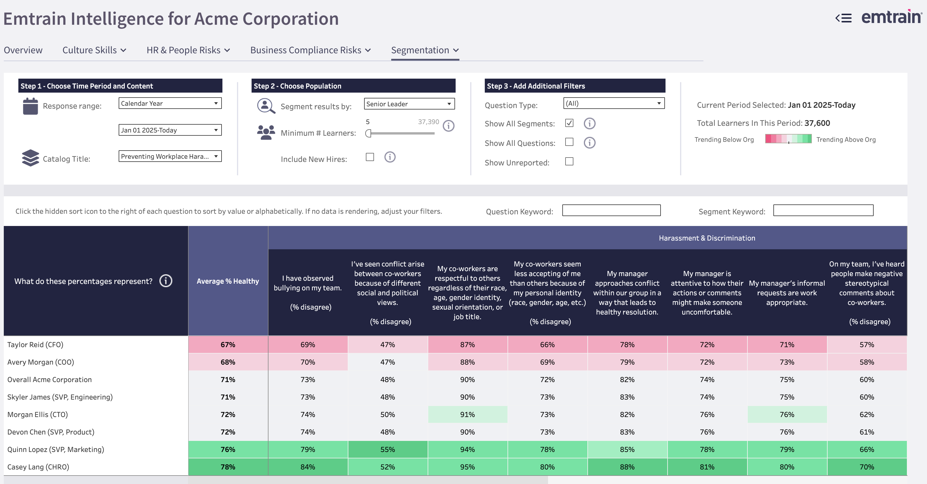 In the example screenshot for Acme Corporation, the results are segmented by Senior Leader for the Preventing Workplace Harassment course. Each row represents responses from an executive’s team, and columns show key questions like “I have observed bullying on my team” or “My co-workers are respectful to others regardless of their race, gender, or identity.”