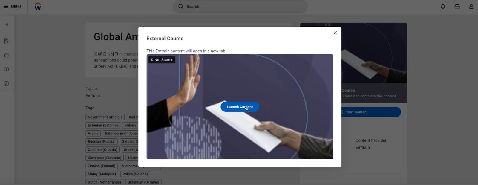 Emtrain content will look just like any other external course in Workday – you can enroll, launch, and complete training with ease.