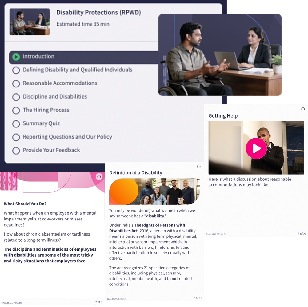 This Course provides insights into India's Rights for Persons with Disabilities Act, 2016 (RPWD), training learners on how to uphold their protections effectively. Learners explore how to determine who qualifies as an individual with a disability, identify essential job functions, and engage in the interactive process to find reasonable accommodations.